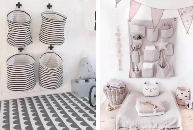 兒童房的收納柜其實也可以用收納袋、布的收納桶來代替。或者是落地帶輪的兒童儲物柜。